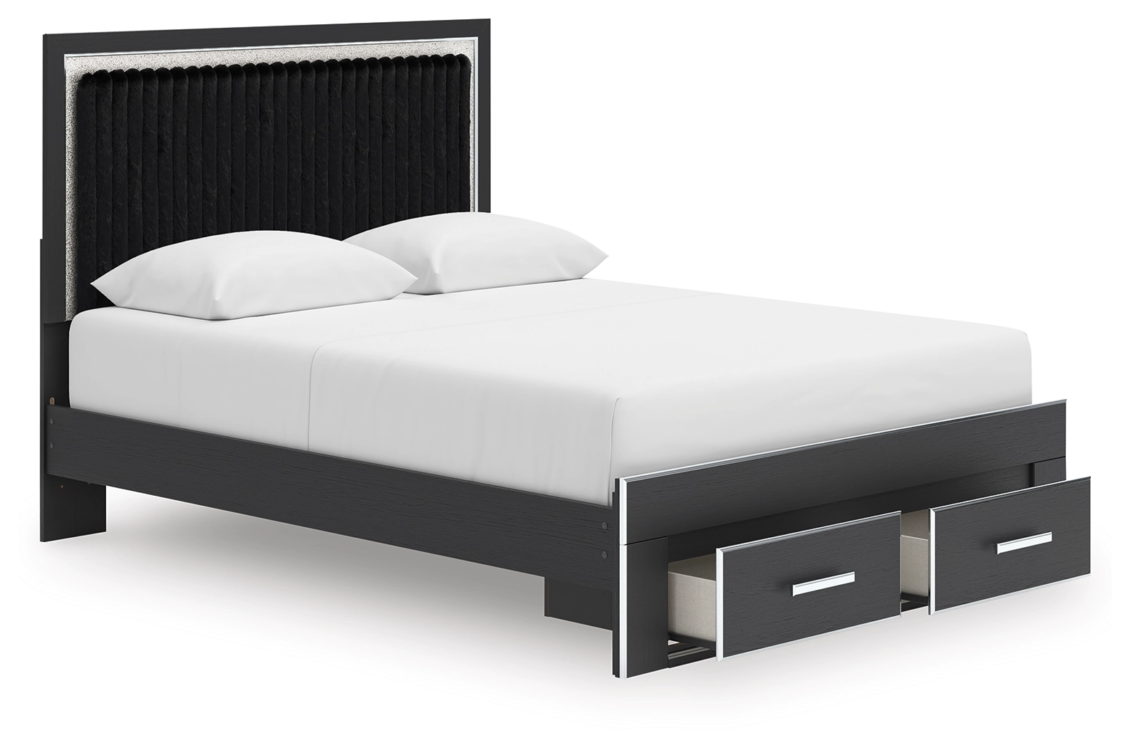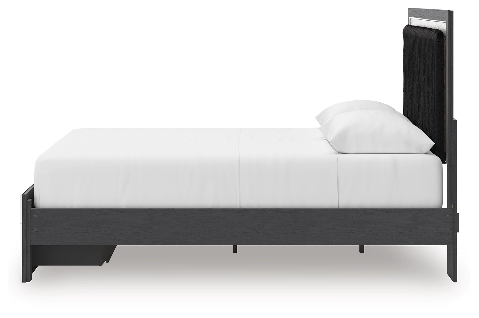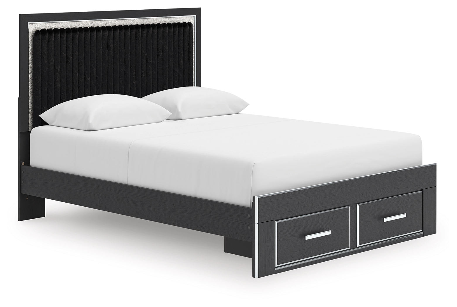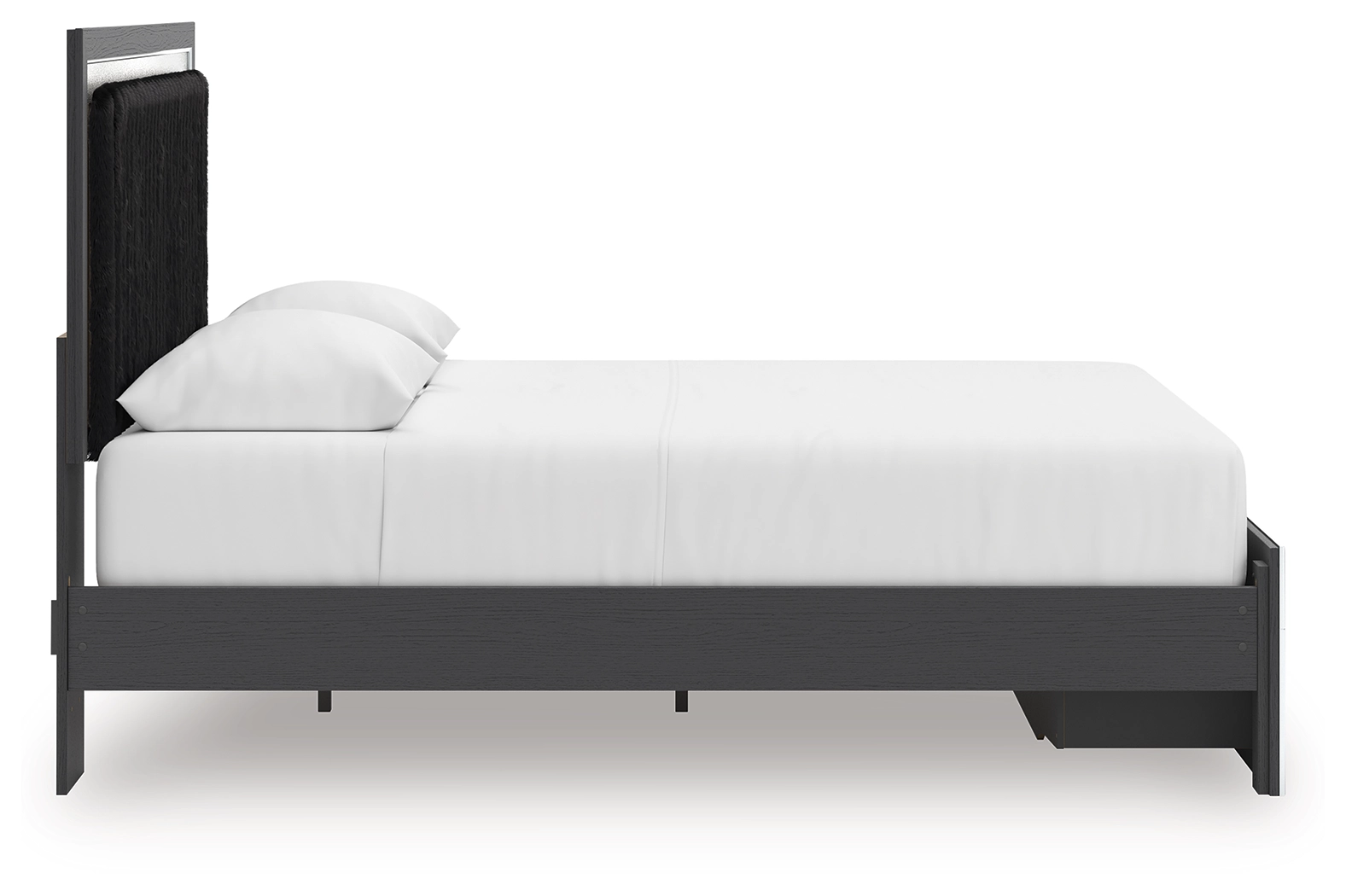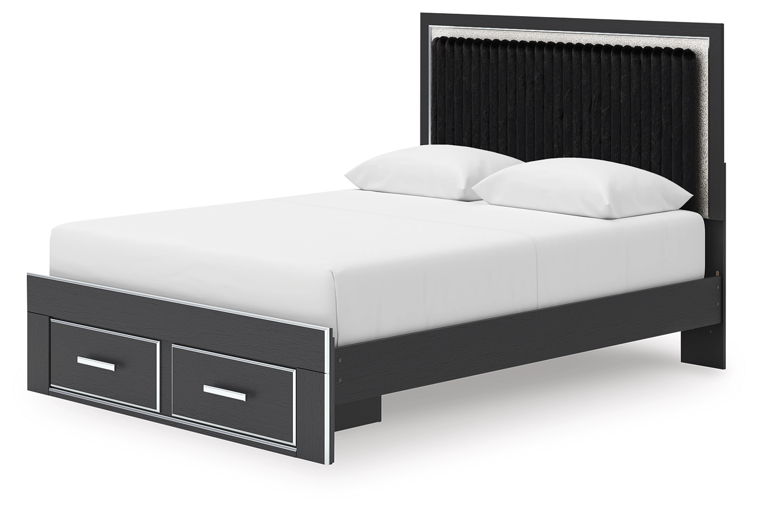 Includes upholstered panel headboard, storage footboard, roll slats and platform rails
