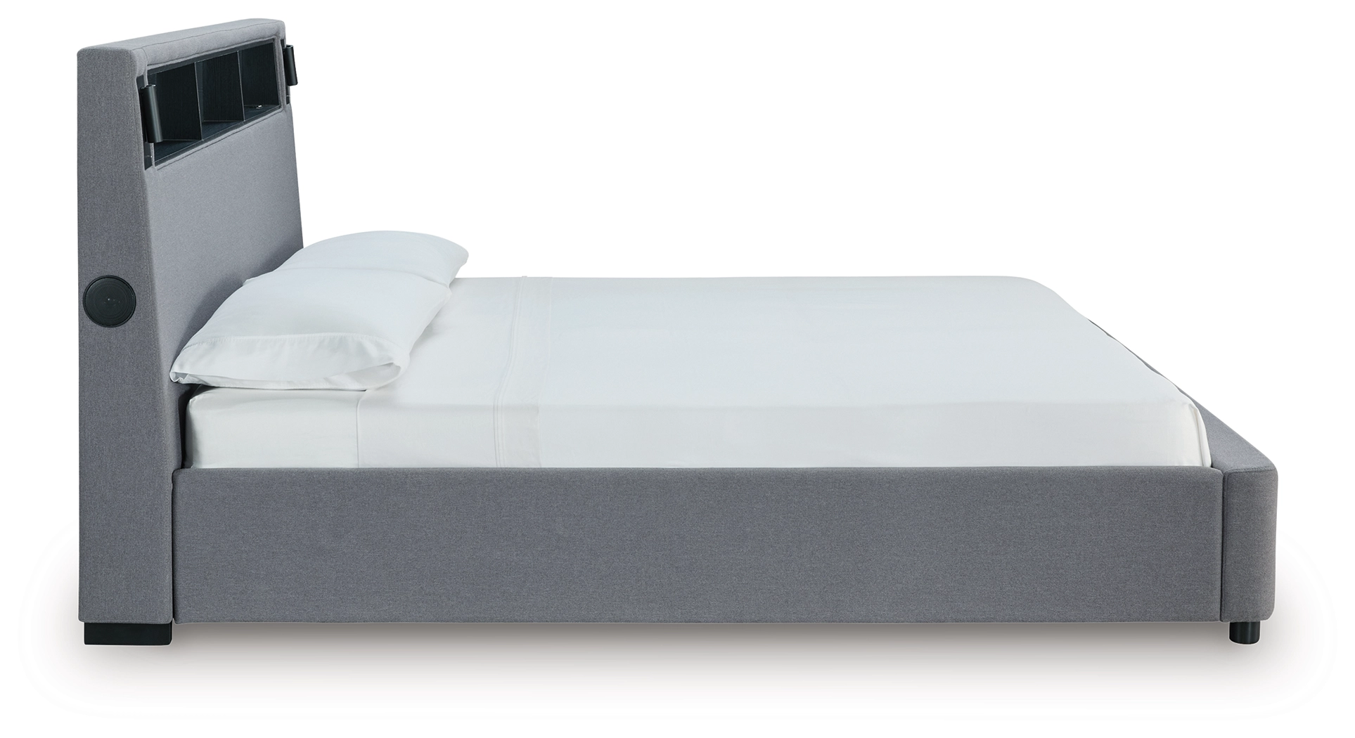 Snooze in style with this king upholstered bed. It brings delightful function to winding down before bedtime, with an adjustable LED reading light on each side. And for added flair, multicolored ambient lighting brings an ultra-cool vibe to the overall look. Combining modern convenience with captivating design, this bed revamps your restful retreat like never before.