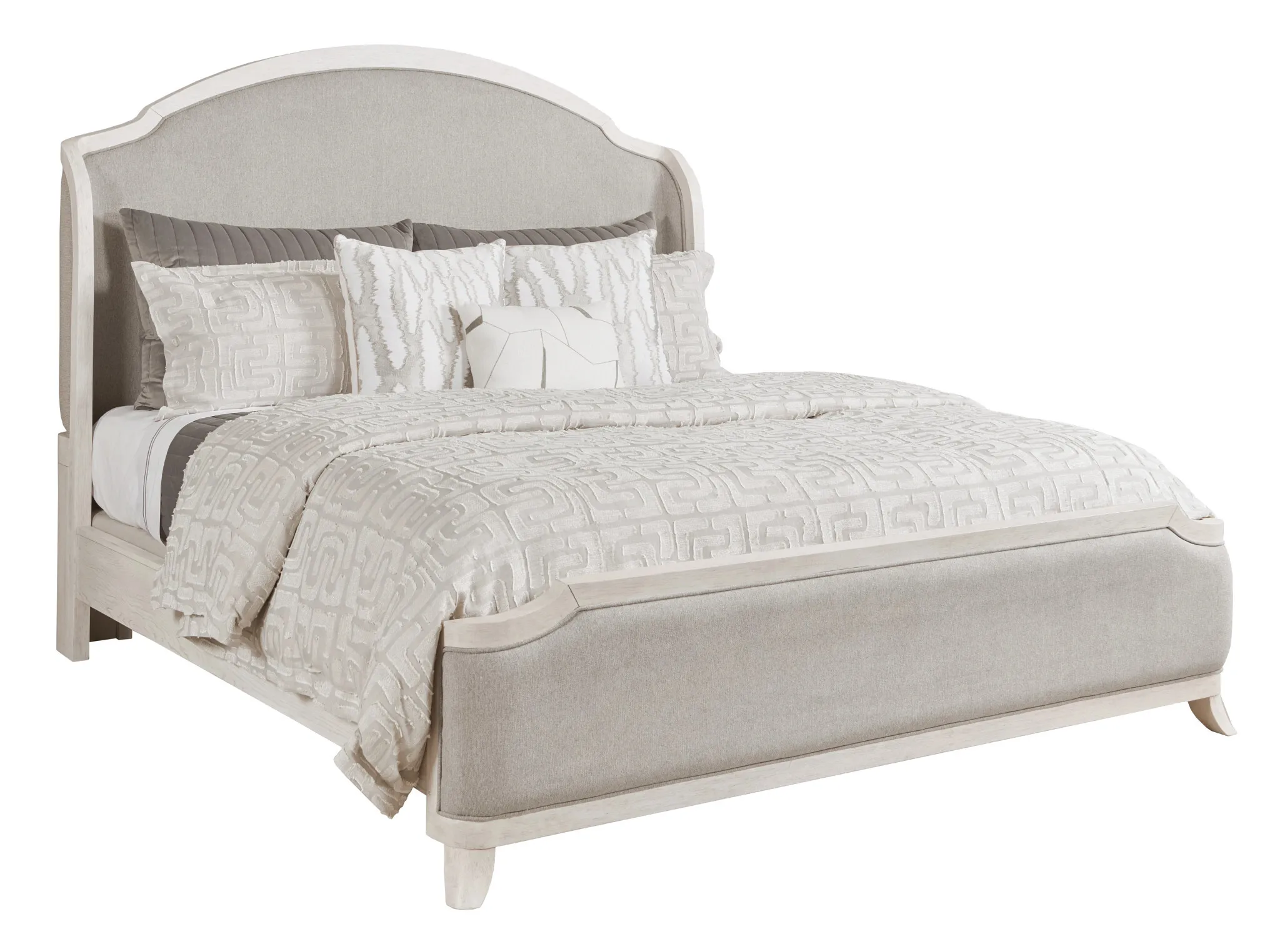 The headboard shape makes it a natural centerpiece with an arch that floats down and curves around framing the soft upholstery which that adds texture in both a visual and tactile sense.