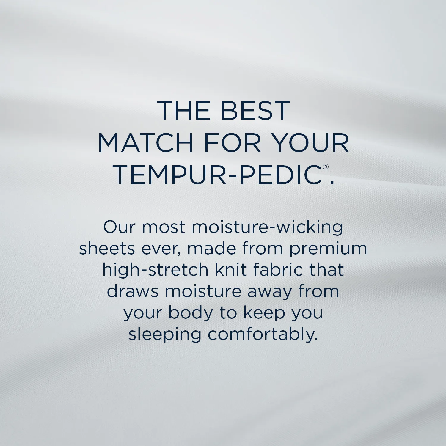 The ultimate match for your Tempur-Pedic® (Alt: Perfect fit. Peak performance.) Our most moisture-wicking sheets ever, made from premium, high-stretch, knit fabric that draws moisture away from your body to keep you sleeping comfortably. These sheets are optimized to perfectly complement your Tempur-Pedic® mattress, with fourway-stretch knit and our signature StayTight™ bands for a snug, secure fit, night after night—no bunching, no creeping corners, and no readjusting needed. Available in White, Sleepy Blue, Sandstone, or Graphite.