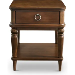 Elegant yet practical, the Bellevue end table is a true heirloom, with everlasting utility in a graceful package. A stately silhouette in a rich whiskey brown finish, this piece will house all your odds and ends and bring some opulence to your organization. The soft-close drawer brings ample space for any need, topped off with a gleaming pewter ring pull. Perched on a traditional, gracefully turned leg, the Bellevue end table is enduring style in a functional, everyday package.