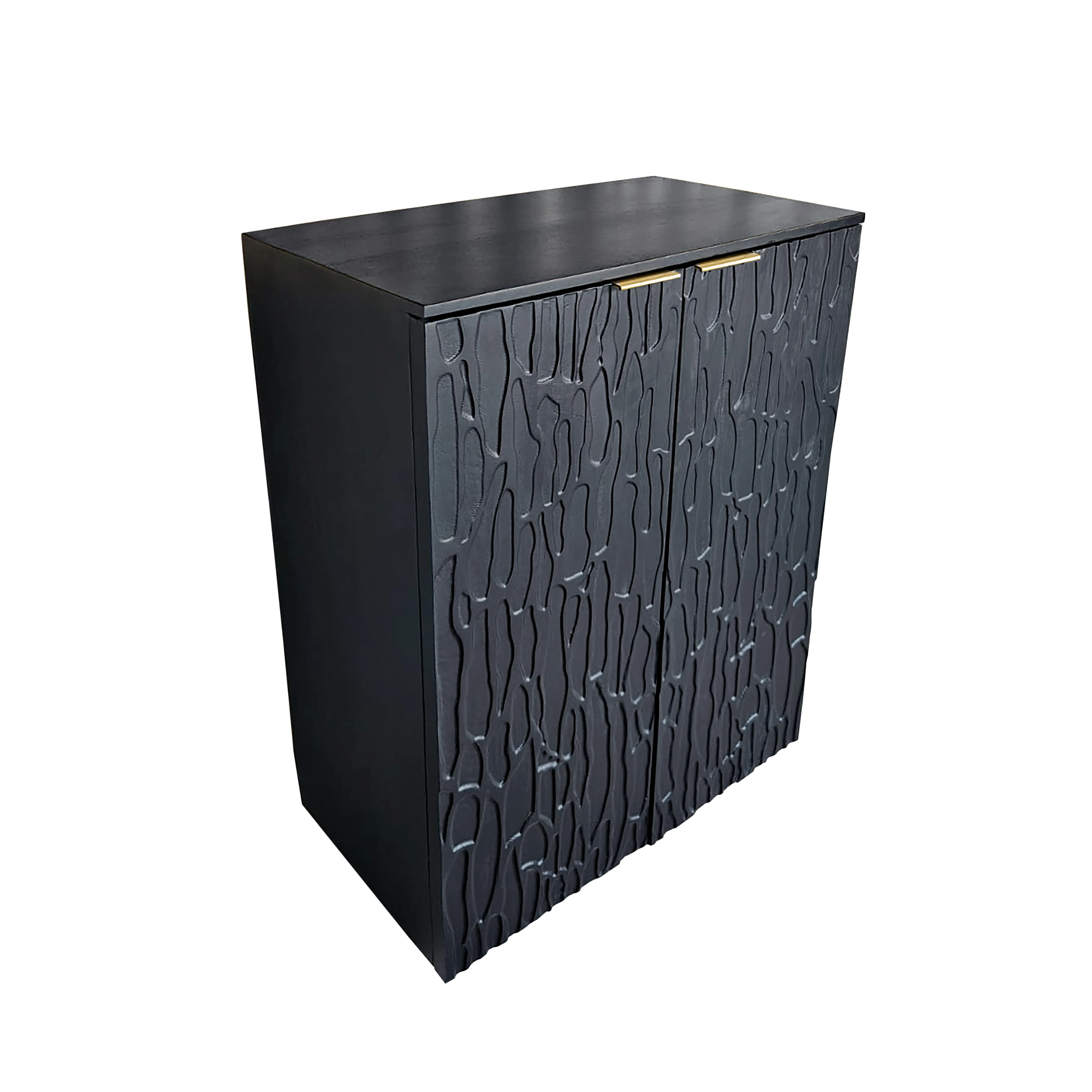 Designed with versatility in mind, this black wood bar cabinet offers a sculpted, modern look with subtle texture and refined detailing. Behind the carved doors, two fixed shelves provide space for bottles, glassware, or entertaining essentials. Brass-finished finger-ledge pulls, European hinges, and floor levelers complete this functional piece with quiet sophistication