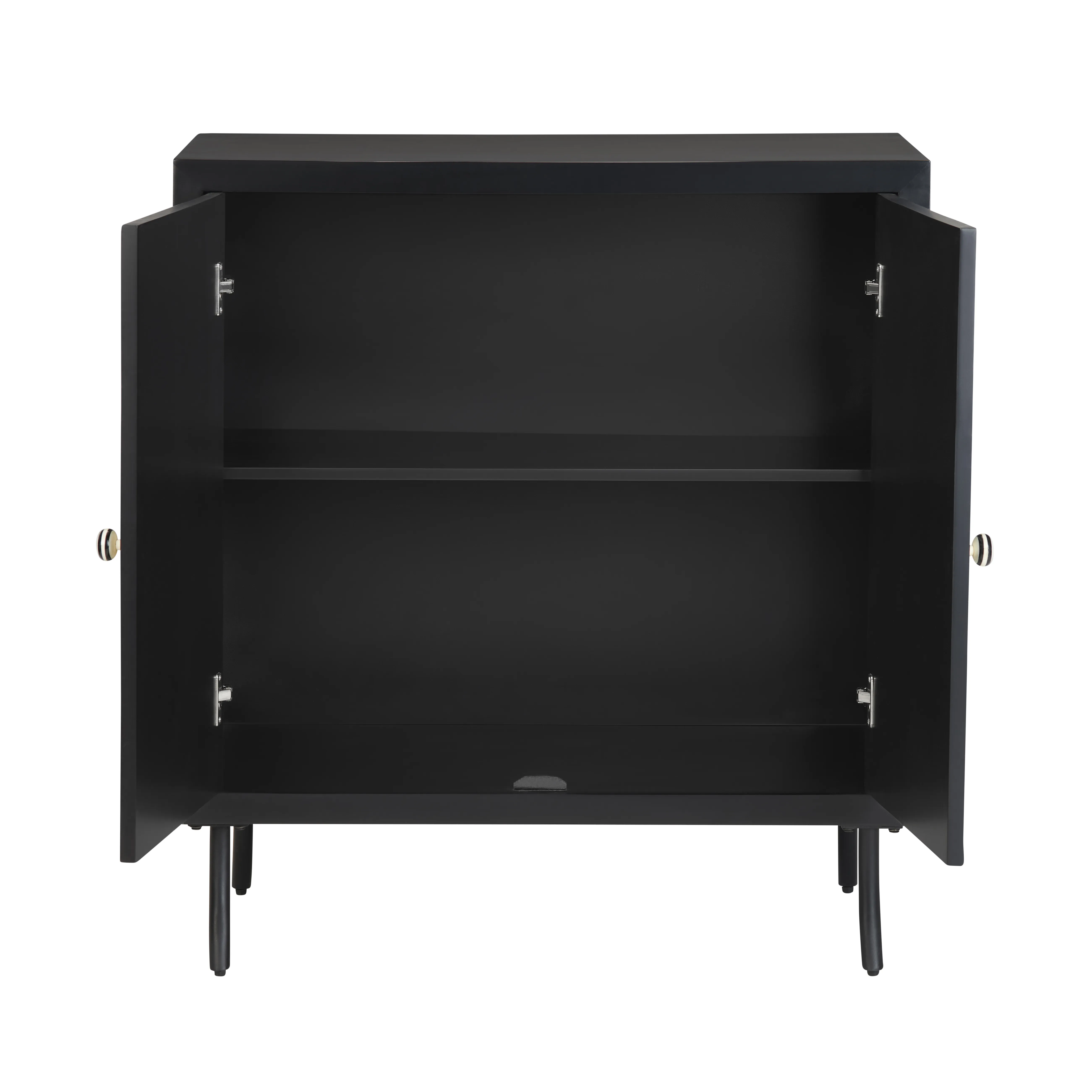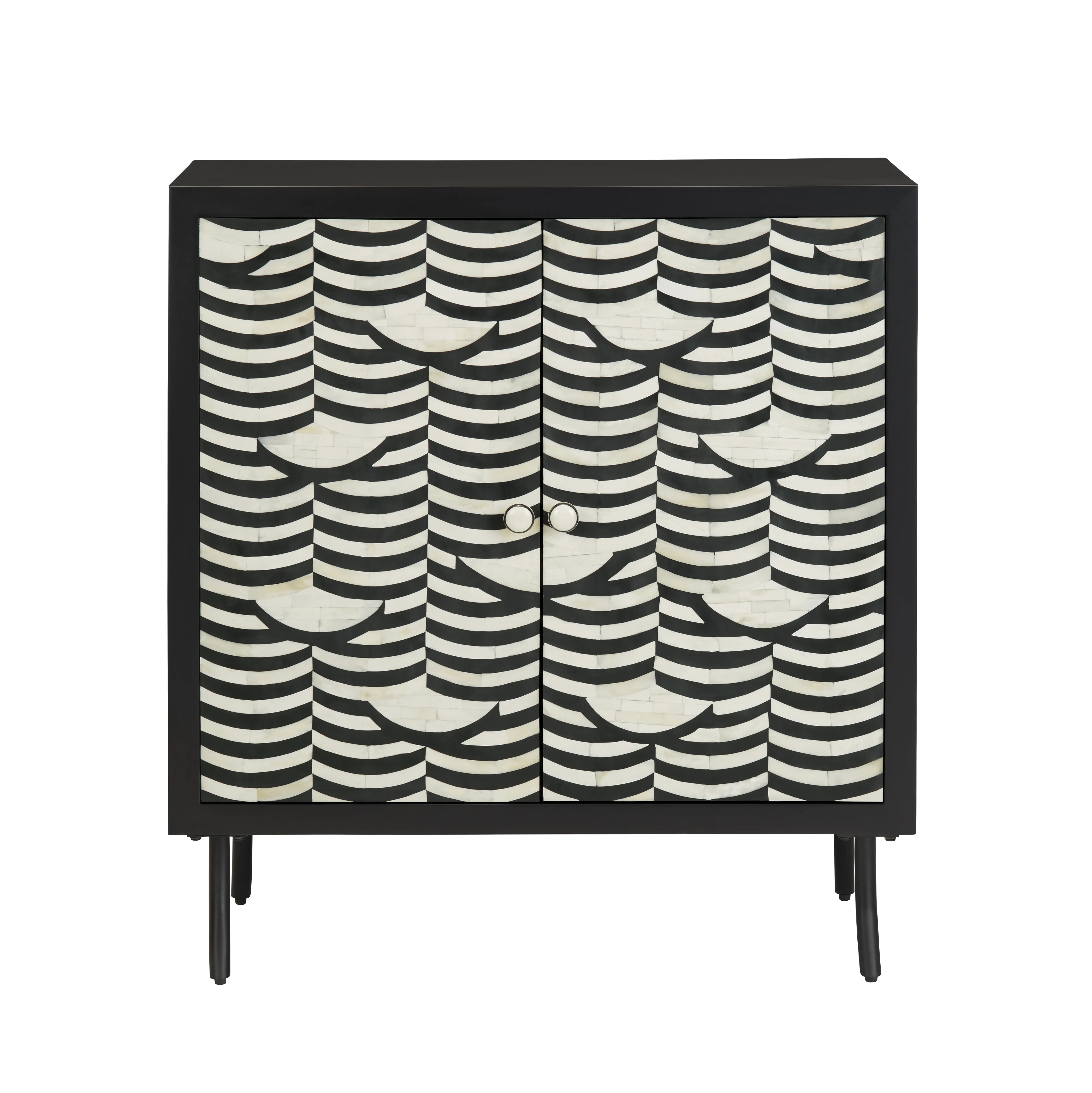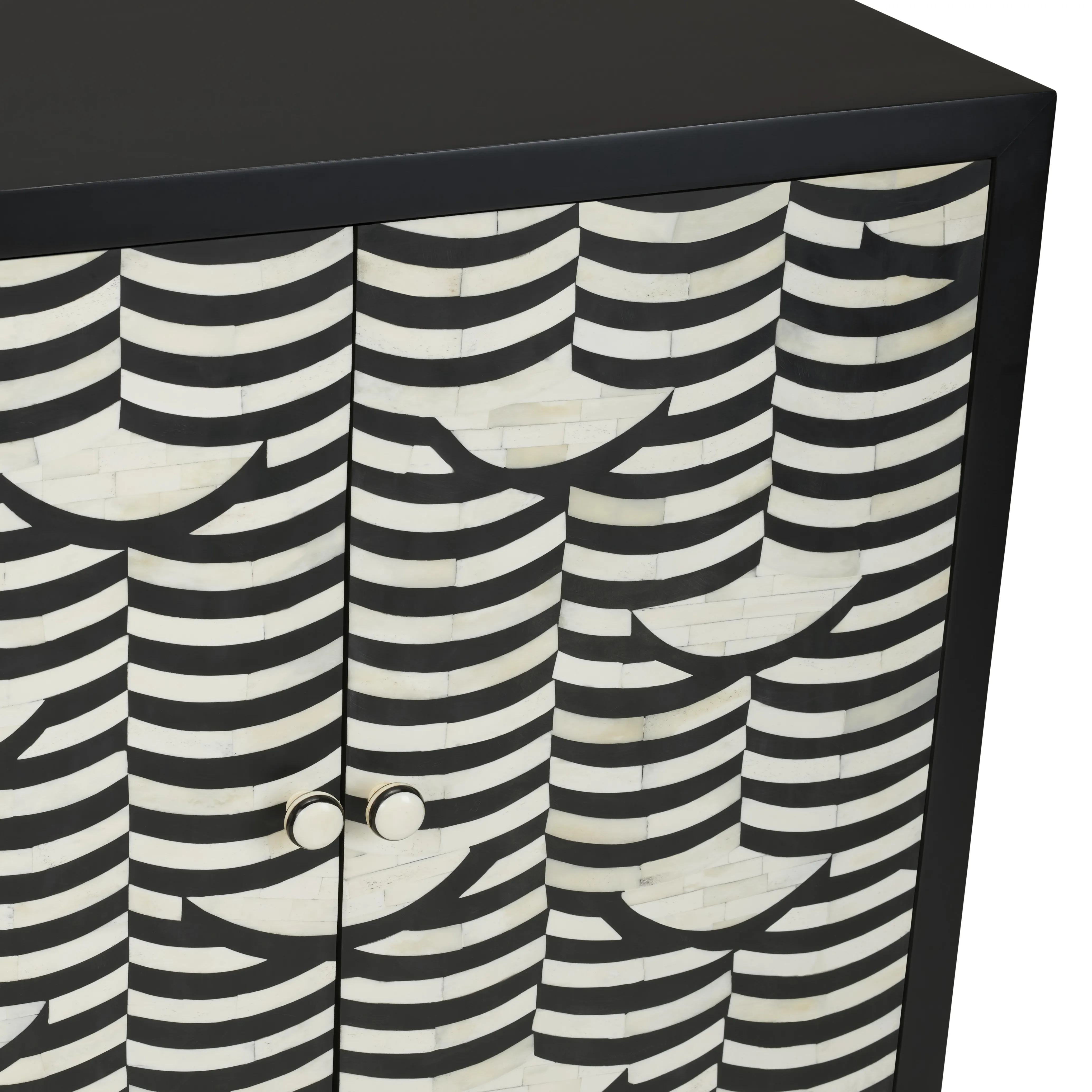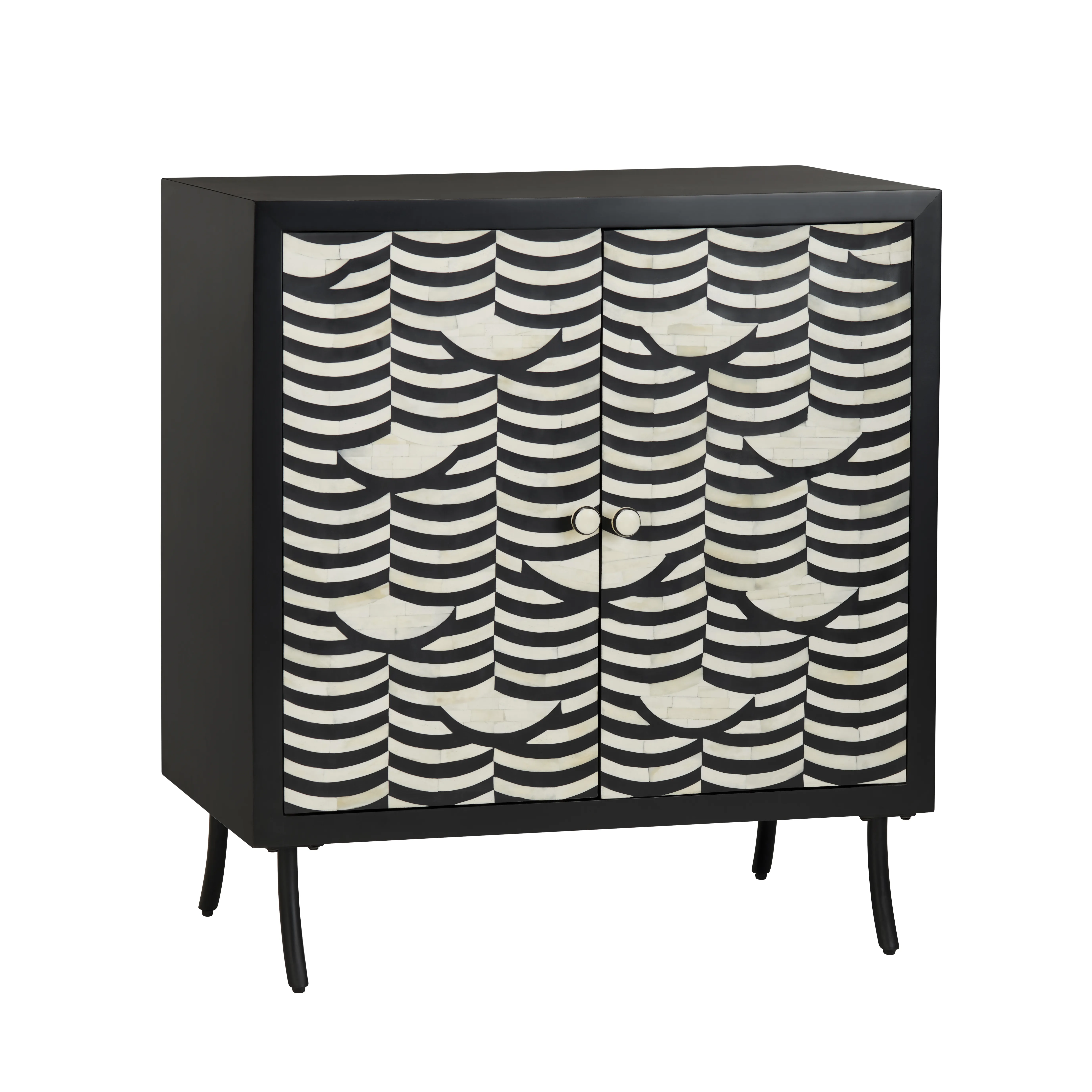 Compact in scale but bold in impact, this two-door accent cabinet features bone inlay across the door fronts in a sculptural black and white wave-like pattern. Crafted from mango wood, it rests on polished black iron legs with floor levelers for stability. The interior includes one fixed shelf, while soft-close European hinges and painted-finish knobs add refined function to this striking statement piece