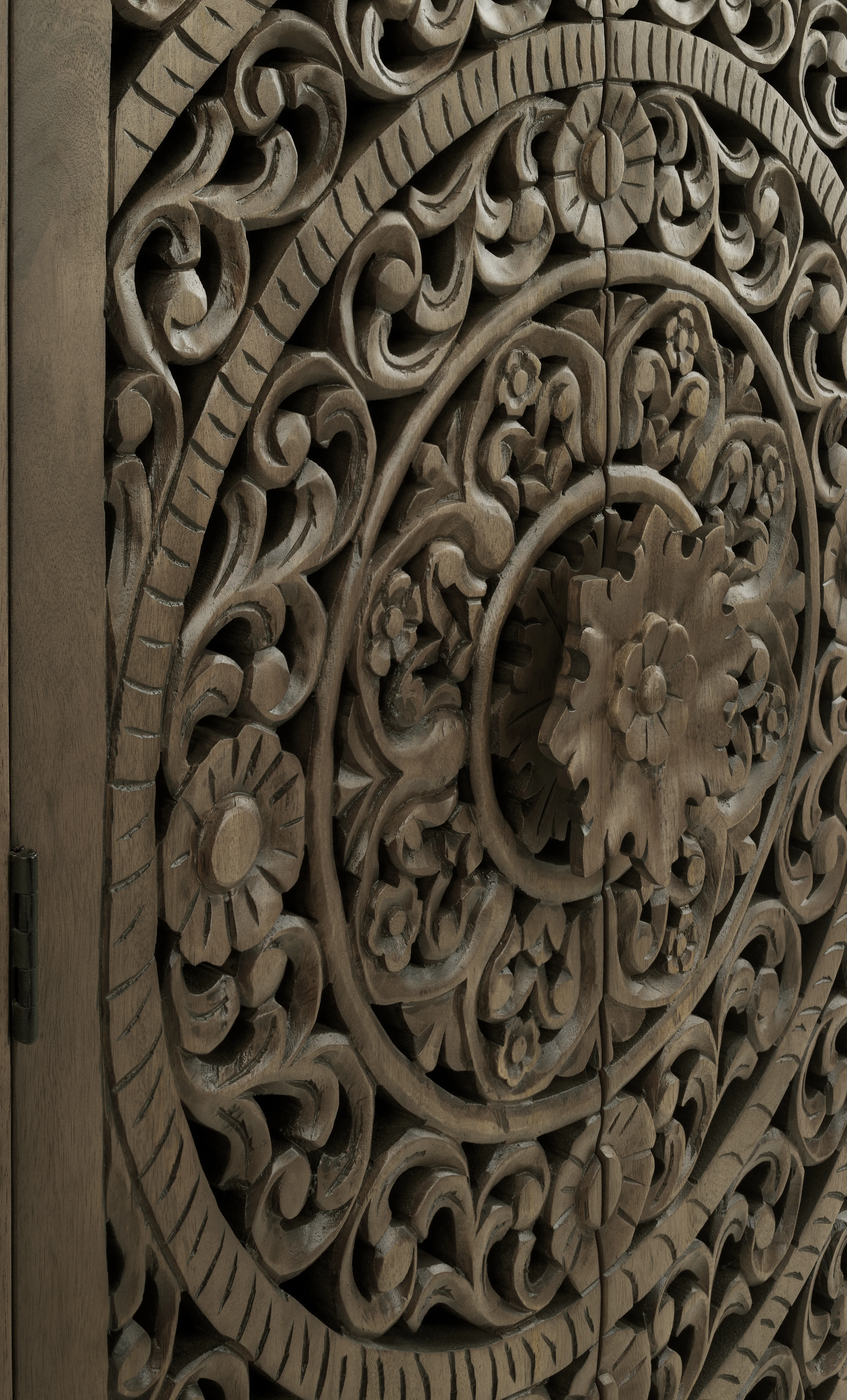 Detailed carved doors featuring floral and scroll motifs make this wood cabinet a striking accent piece. A sculptural flower-shaped center handle enhances the artisan appeal. Behind two hinged doors are four fixed interior shelves for practical storage. Designed with standard hinges, double roller catch closures, and floor levelers, it blends beauty with everyday functionality