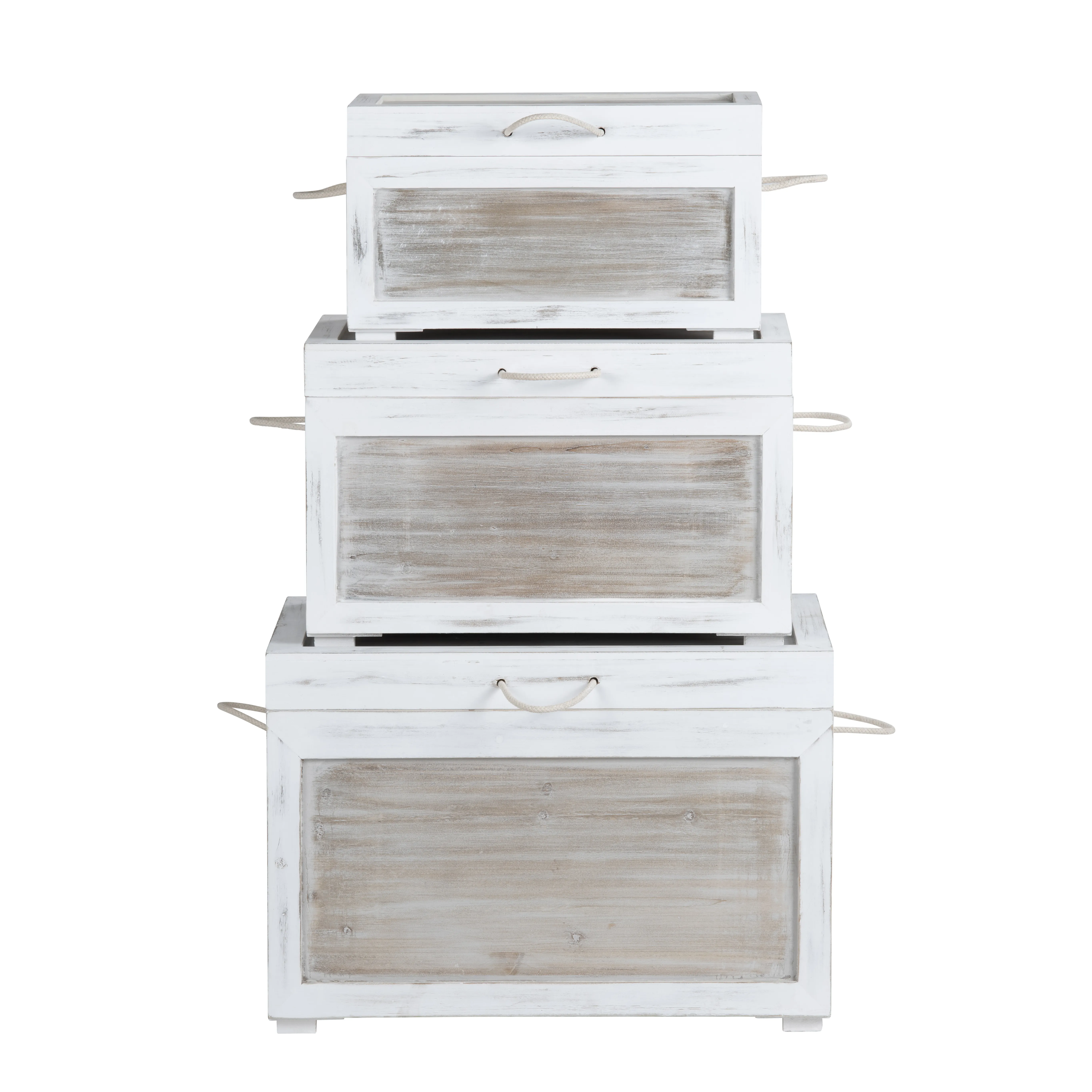 This set of three wooden storage trunks combines rustic charm with practical storage & organization. Featuring a distressed finish in a natural and white color palette, each trunk has a rectangular shape and is adorned with rope handles on the sides for easy transport. The weathered wooden panels framed by a whitewashed border enhance the vintage aesthetic. The hinged lids offer easy access, while the sturdy construction ensures reliable storage. Best of all, no assembly is needed—just place them where desired for stylish organization