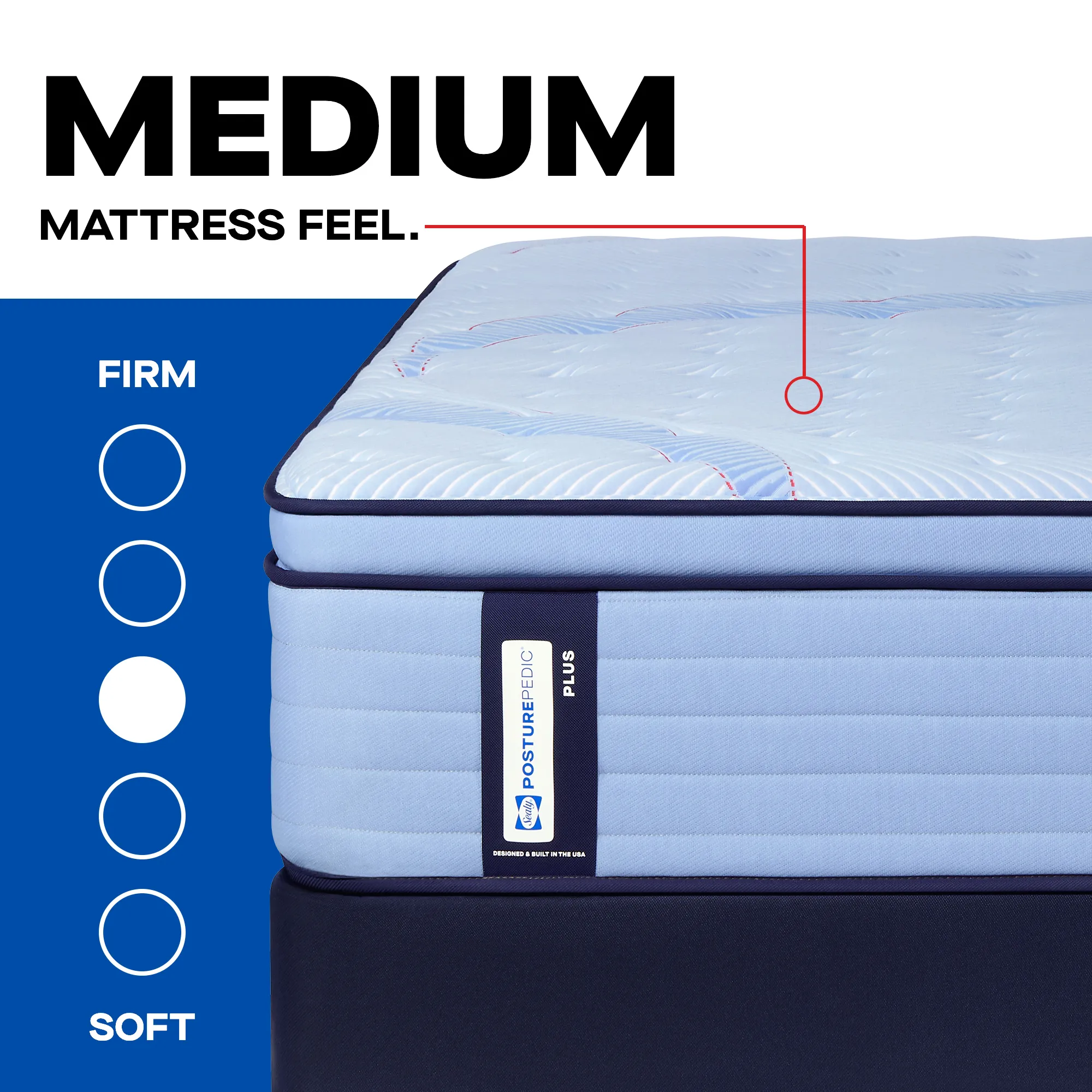 The Sealy Posturepedic® Plus Spring Medium mattress delivers pressure-relieving comfort to help maintain natural body alignment and reduce nagging Bed Aches™ night after night. The orthopedic-inspired Posturepedic® Plus Support System features exclusive PrecisionFit™ Coils, arranged right where you need them. Plus the DuraFlex™ Coil Edge provides a reinforced solid surface, making the Sealy Posturepedic® Plus Spring Medium mattress built to last.