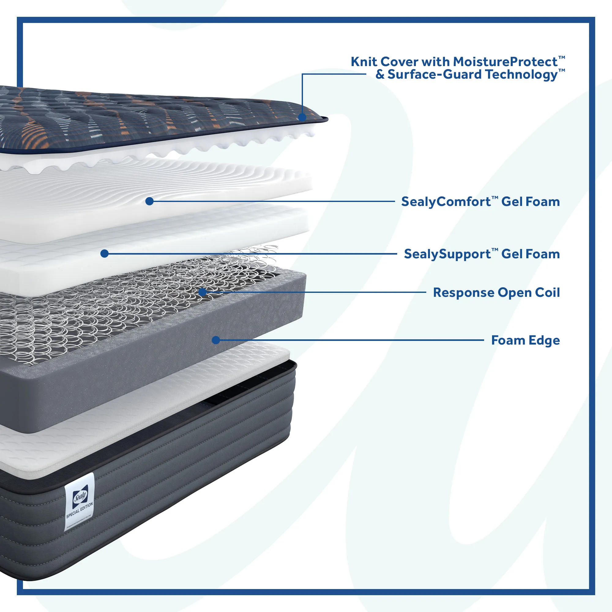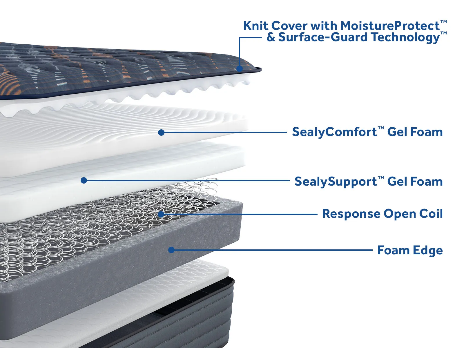 Layers of Sealy® gel foams combine with precisely engineered open coils to deliver flexible, breathable, personalized comfort with conforming support and a firm feel.